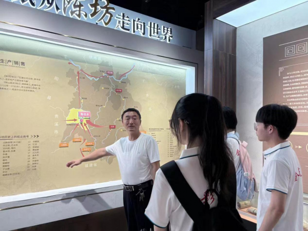 在连四纸非遗展馆内,邱辉详细讲解造纸“选、料、工、心”的传统工艺,阐释其与赣商“诚、精、韧、信”经营理念的内在契合,帮助实践队员体会古法工艺中蕴含的品质追求与商道智慧。