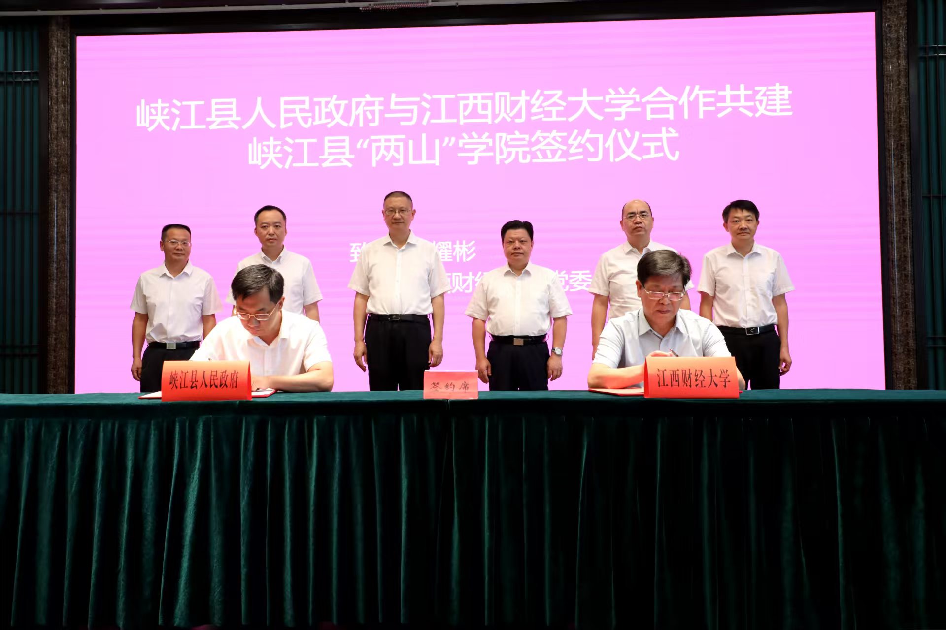 8月1日,学校与江西省峡江县人民政府签署“两山”学院共建协议,标志着校地双方在践行习近平生态文明思想、探索生态产品价值实现路径上迈出关键一步。校党委书记刘耀彬,党委常委、副校长袁红林,峡江县委书记尹嵘峰等出席签约仪式,共同为“两山”学院揭牌,并就深化校地合作、推动绿色高质量发展达成共识。
