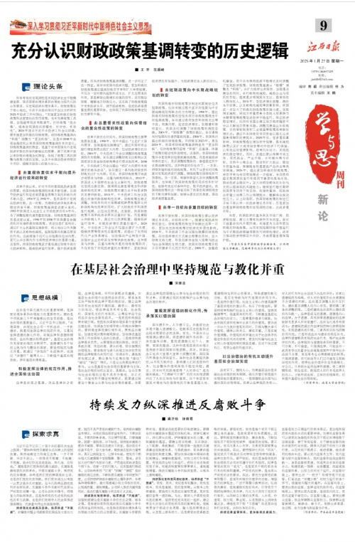 1月27日,《江西日报》“学与思”周刊刊登学校原党委书记王乔教授等的理论文章《充分认识财政政策基调转变的历史逻辑》。文章从宏观经济治理的角度,深入探讨了我国财政政策基调由“积极”调整为“更加积极”的历史逻辑和现实意义。