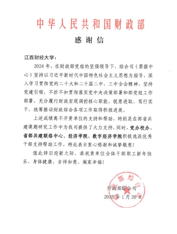 近日,财政部综合司向我校发来感谢信,对我校在部省共建课题研究、优秀干部选派等方面提供的大力支持表示感谢。