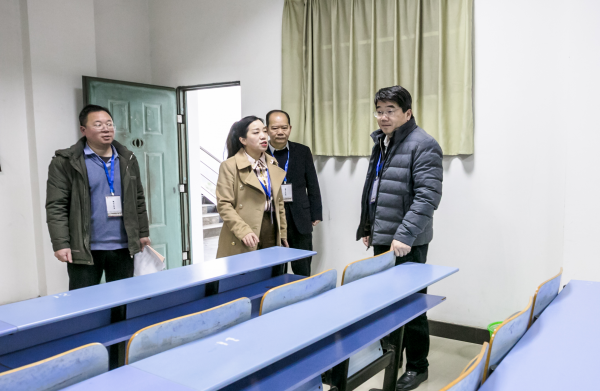 2月19日,新学期第一天,为确保本科教学工作平稳有序开展,校长邓辉、副校长李春根来到教学一线,对新学期本科教学运行情况进行了全面检查,教务处处长万建香、副处长胡德龙陪同。