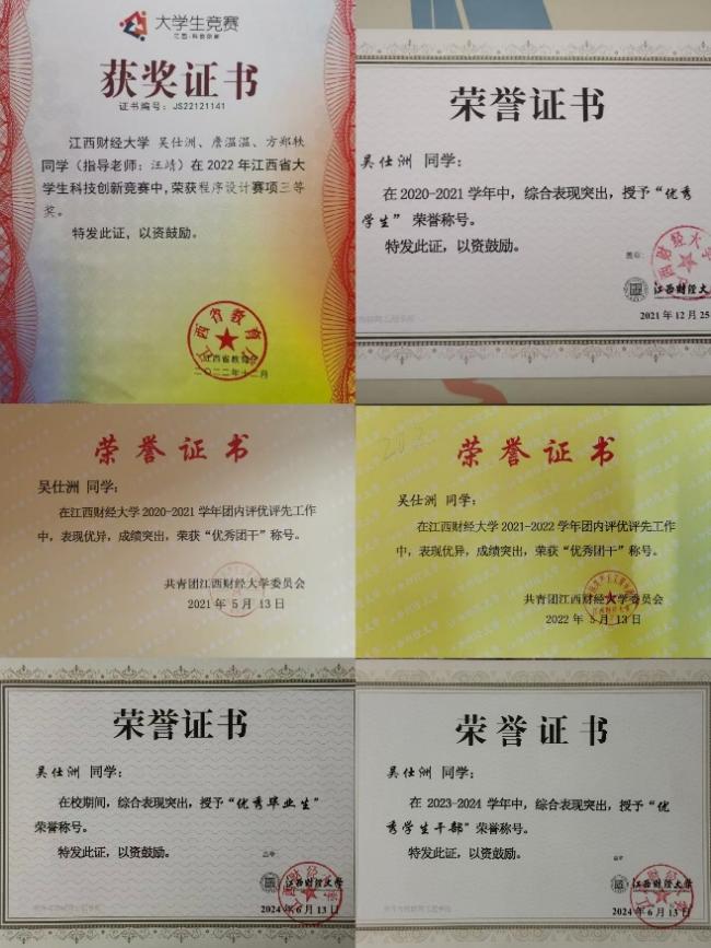 【个人简介】吴仕洲,2020级软件工程专业学生,大学时光里,他宛如“多面手”,活跃于多个岗位。在大学生传媒联盟网新办、院学生会组织部等,他积极策划活动、严谨整理信息、高效组织会议,用行动诠释责任担当,百年校庆活动中也留下他忙碌且热忱的身影。荣誉是对他努力的肯定,“优秀学生”“优秀团干”等称号纷至沓来,党校与青马工程“优秀学员”见证思想成长。学业与实践领域,他同样出彩,多次斩获校级奖学金,还在江西省大学生科技创新竞赛中荣获三等奖。大四时,怀揣教育理想的他加入“映山红”研究生支教团,毕业后奔赴四川小金县美兴中学支教,为孩子们打开知识之窗。如今,完成支教服务的他重返江财,开启硕士研究生求学新征程,以青春之姿,在求知路上不断奋进,续写精彩篇章。