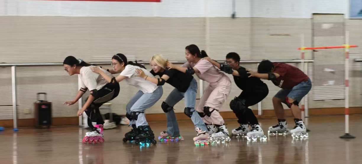 赛场旁,前几支队伍过弯时不慎滑倒的画面,让空气中多了几分紧张。但金融学院的队员们彼此鼓劲,“别怕,按练的来!”“我在你后面护着!”简单的话语里,藏着无数个日夜共同训练凝聚的深厚情谊与绝对信任。还记得为了备战比赛,队员们每天清晨迎着晨光集结,傍晚披着晚霞加练摔倒了就立刻爬起来,膝盖上的淤青是努力的印记;学长学姐放弃休息时间,手把手纠正队员的姿势,从重心控制到过弯技巧耐心讲解每一个细节。那些浸透队服的汗水,那些反复打磨的动作,都是他们吃苦耐劳的最好勋章。