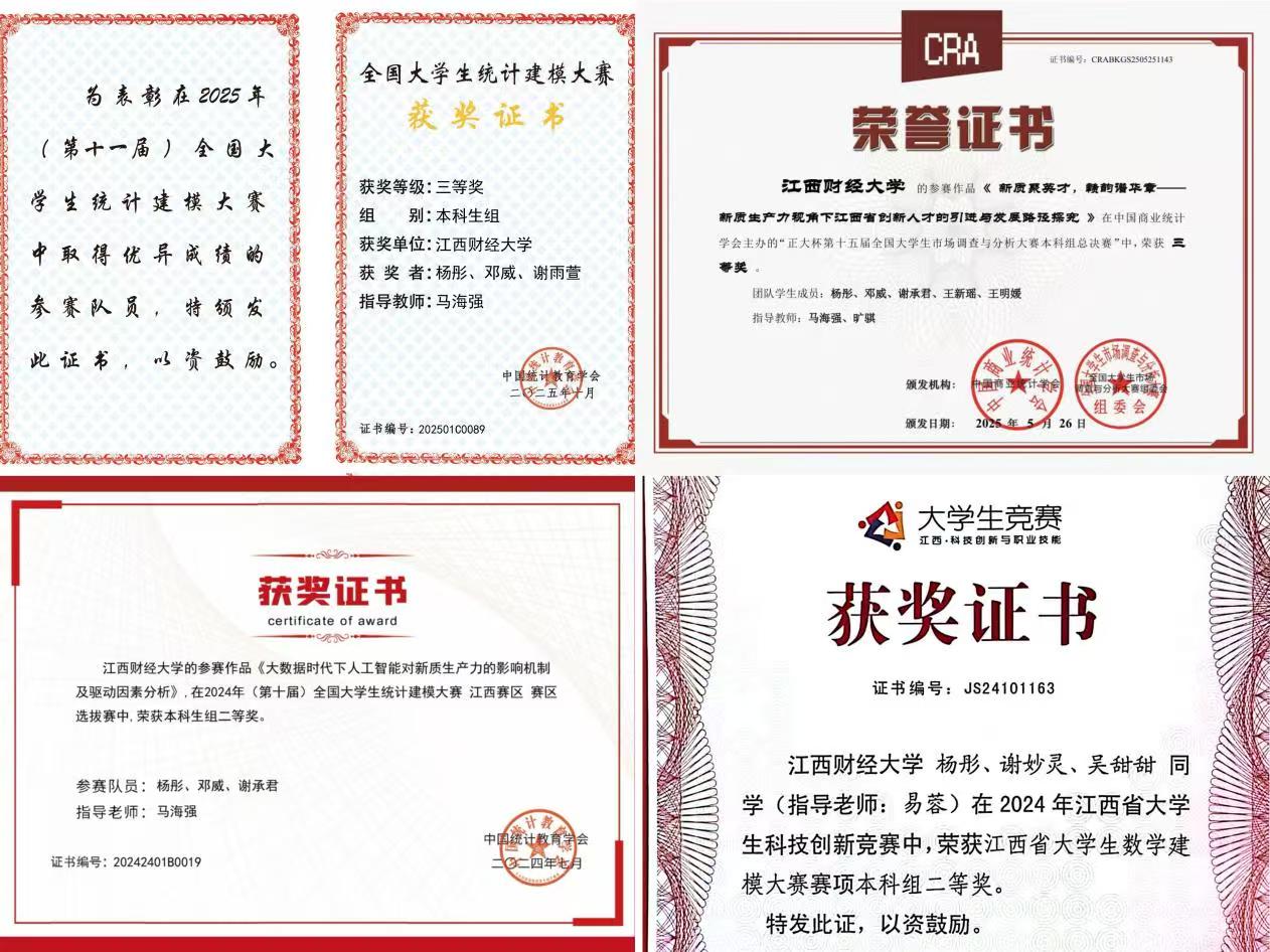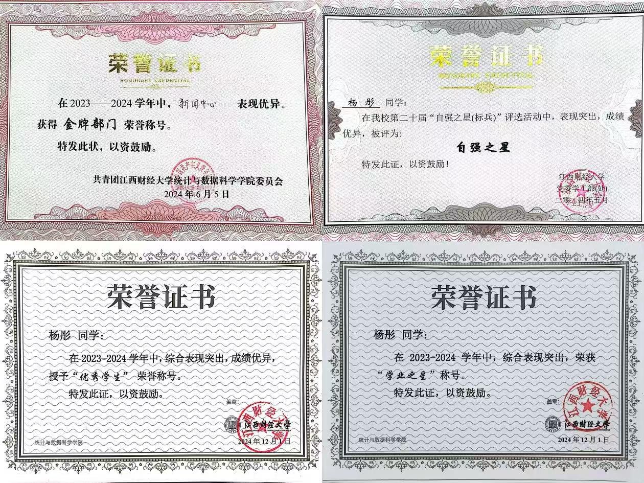 个人简介:杨彤,中共党员,统计与数据科学学院应用统计学2022级学生,加权成绩达到92.25分,专业排名第二。在校期间担任统计与数据科学学院新闻中心负责人、24级助理班主任、党支部宣传委员等多项职位,并在院新闻中心任职期间以第一名荣获“金牌部门”称号。竞赛方面,杨彤以项目负责人身份,荣获市场调查与分析大赛、统计建模大赛国家级三等奖;斩获数学建模竞赛、“华创杯”市场调查分析大赛等多项大赛的省级二等奖。本科学习阶段,以第一作者身份发表学术论文一篇,受邀参加第四届数据科学与现代经济统计研讨会、2025年厦门大学新时代经济统计学科发展研讨会。凭借优异的个人能力获优秀学生标兵、学业之星、自强之星、优秀团干等20余项荣誉称号,更获得国家奖学金、校级一等奖学金、企业奖助学金等10余项奖学金。现已保研至中山大学。